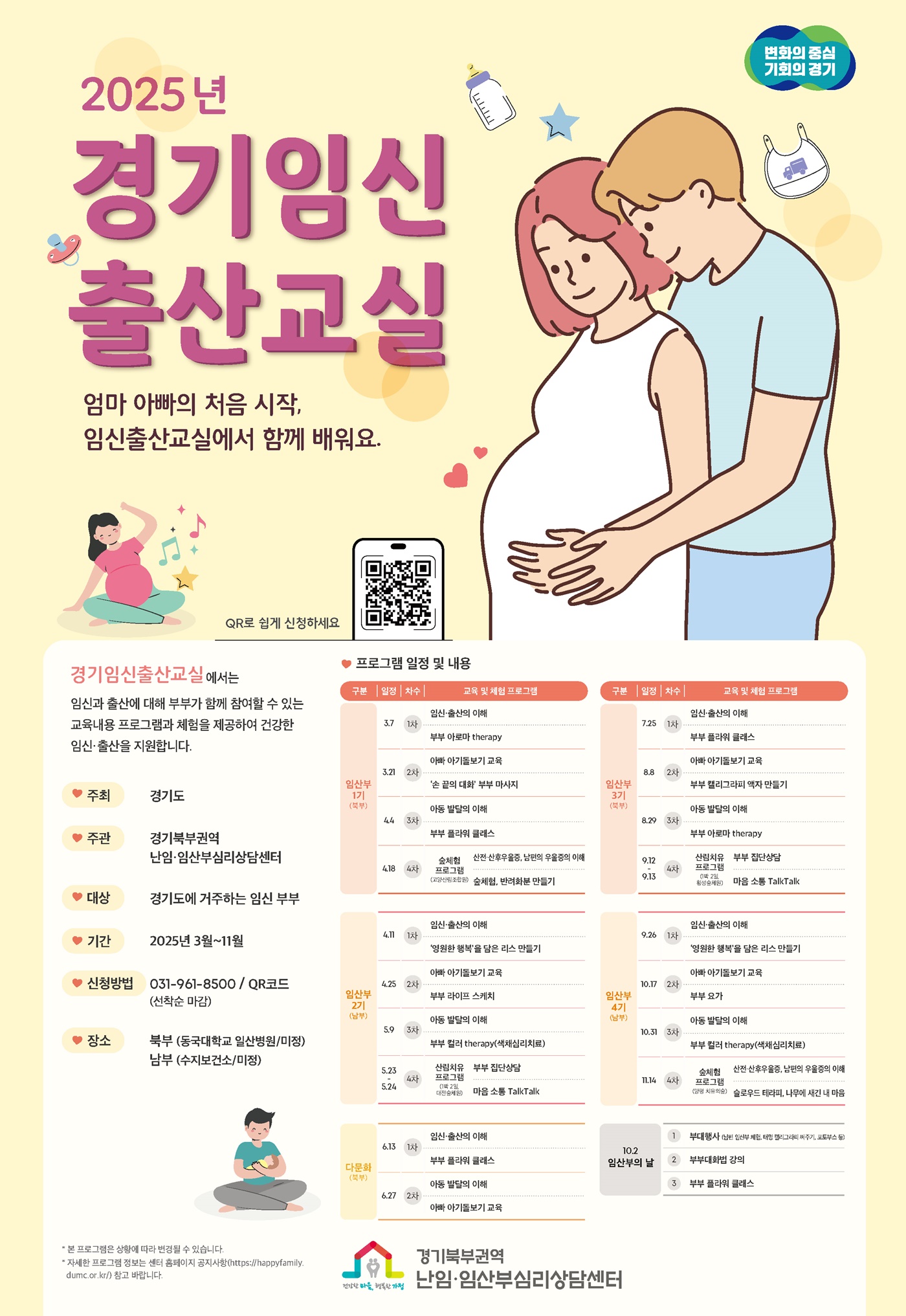 프로그램 참여 신청은 경기북부 권역 난임․임산부심리상담센터를 통해 전화(031-961-8500~8502) 및 누리집(https://happyfamily.dumc.or.kr/)을 이용해 할 수 있다.