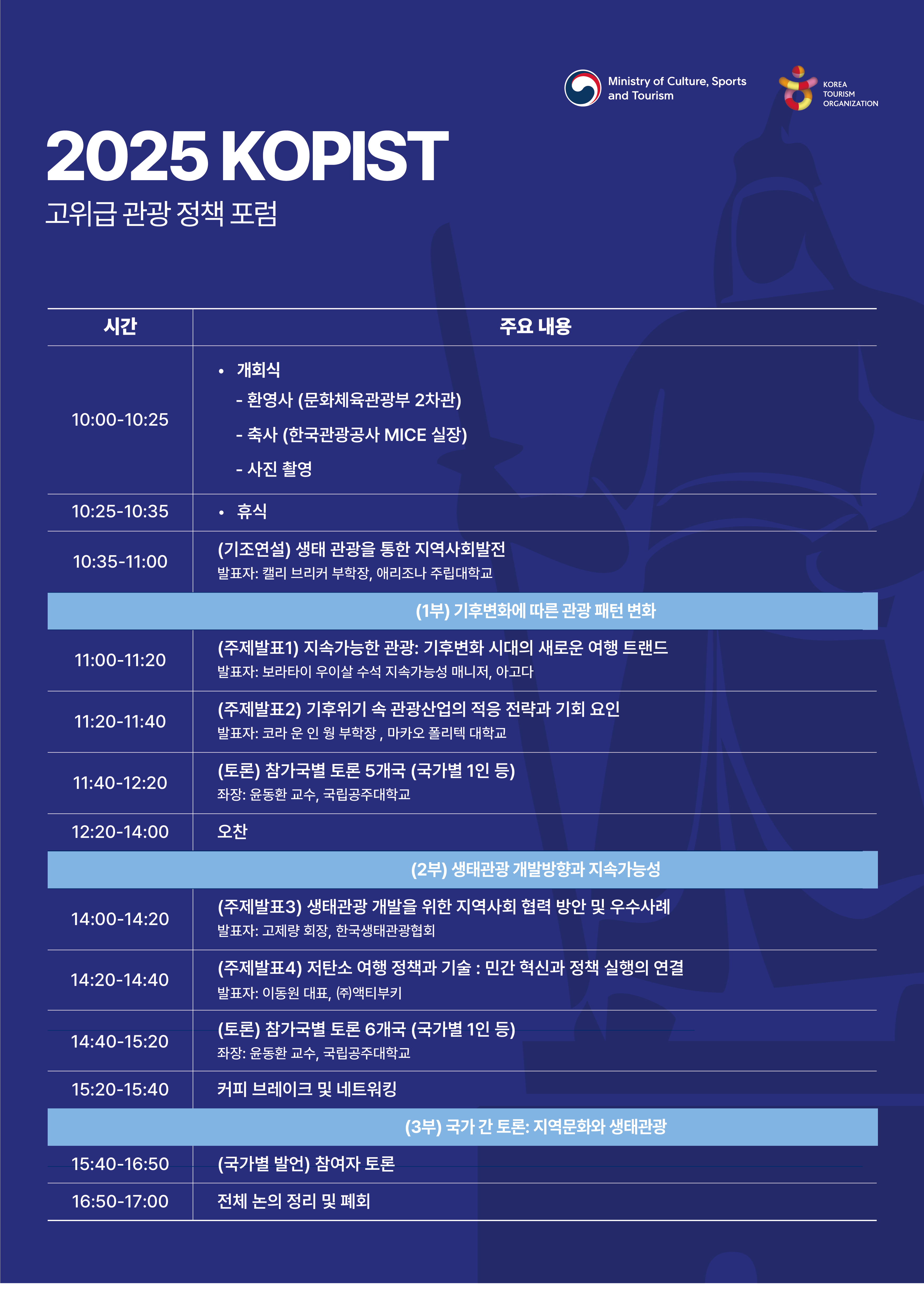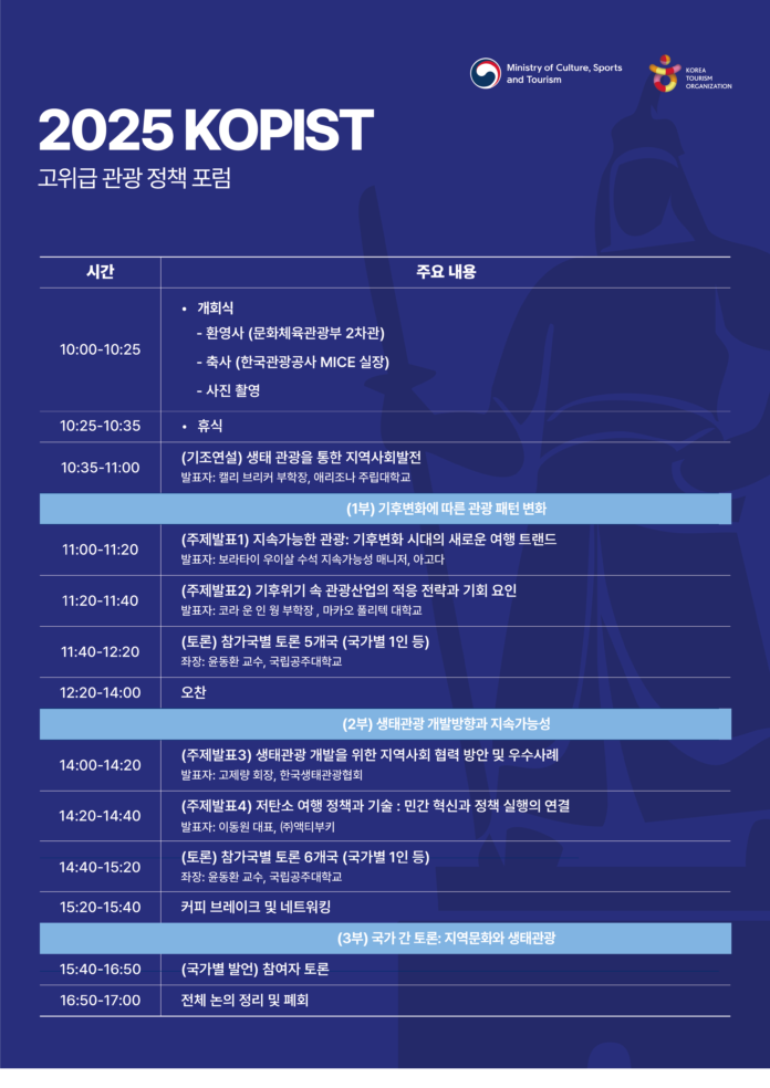 문화체육관광부(장관 유인촌, 이하 문체부)는 한국관광공사(이하 관광공사)와 함께 6월 16일(월), 여수에서 ‘2025 코피스트(KOPIST)* 고위급 관광정책 포럼’을 개최한다.