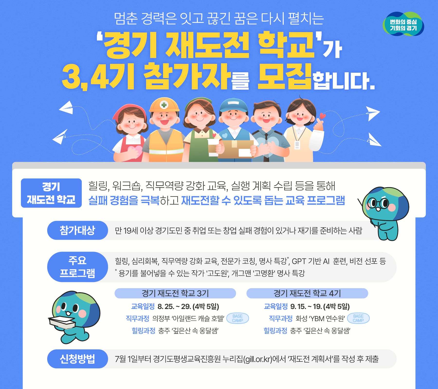 경기도와 경기도평생교육진흥원은 오는 7월 1일부터 ‘2025년 경기 재도전학교’ 제3기와 제4기 참가자를 동시에 모집한다.