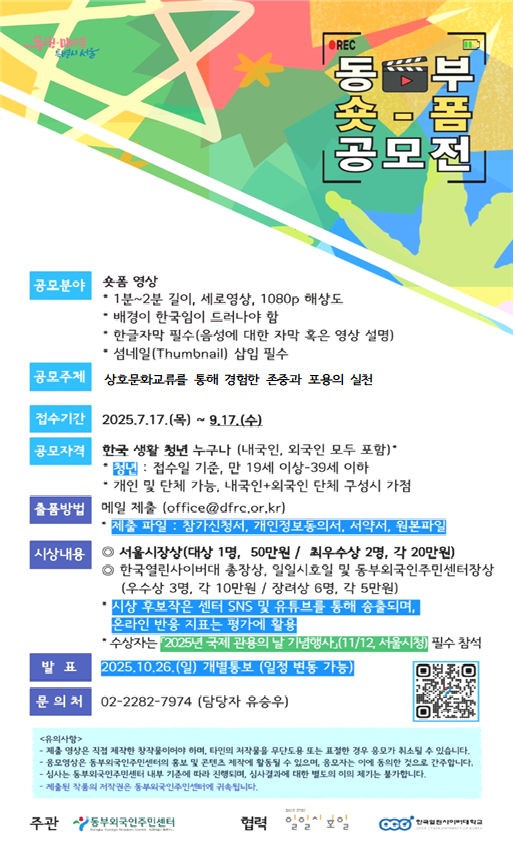 ○ 출품작은 ▴해상도 1080p 이상의 세로형 영상 ▴국내 촬영 배경 ▴한글 자막과 섬네일 포함이어야 하며, 참가 신청서와 함께 동부외국인주민센터 이메일(office@dfrc.or.kr)로 제출하면 된다.